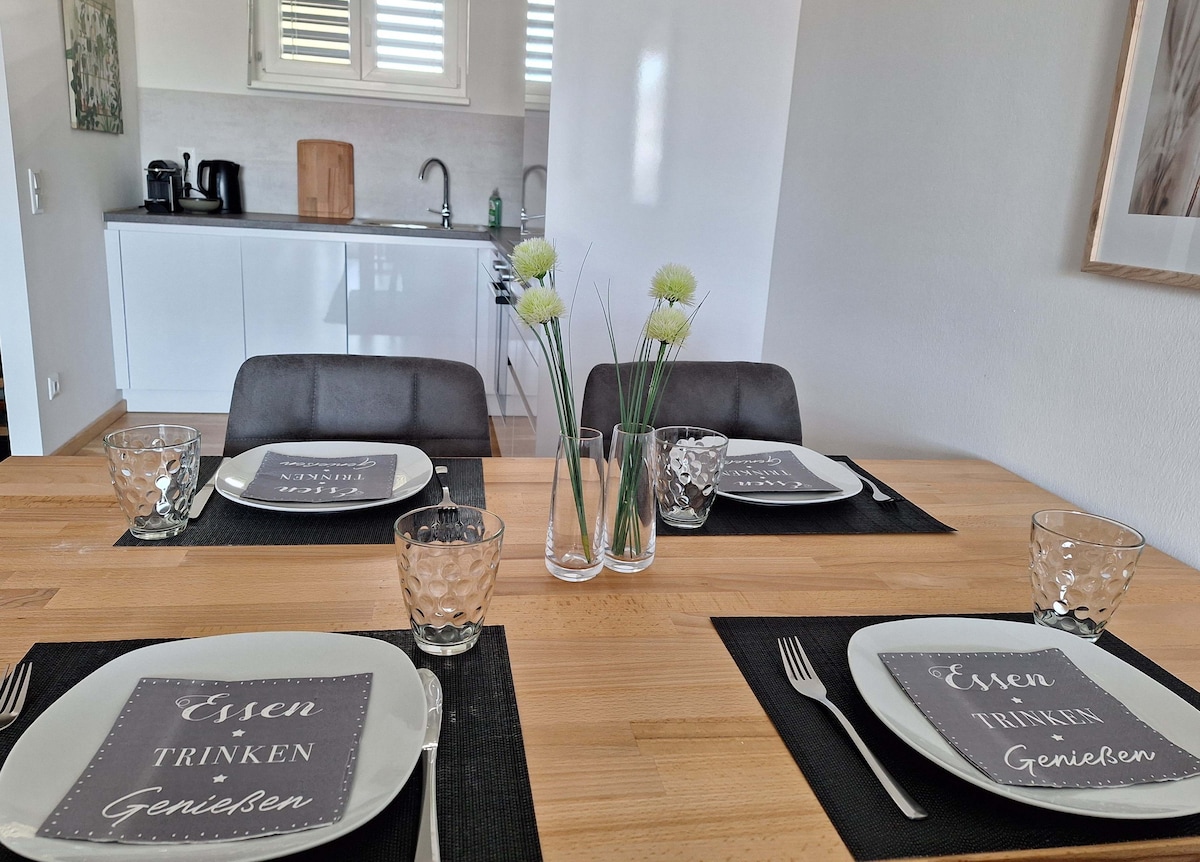 The newly furnished, modern 46 m² apartment with 12 m² west balcony is located on the 2nd floor and offers comfort and coziness for up to 4 guests. It consists of a spacious living room with a pull-out, comfortable sofa bed, a dining and work area as well as a fully equipped kitchen, a bedroom and a bathroom. Advantages include high-speed Wi-Fi, a smart TV, washing machine, capsule coffee machine, underground parking space incl. an e-charging station, an elevator and insect screens.