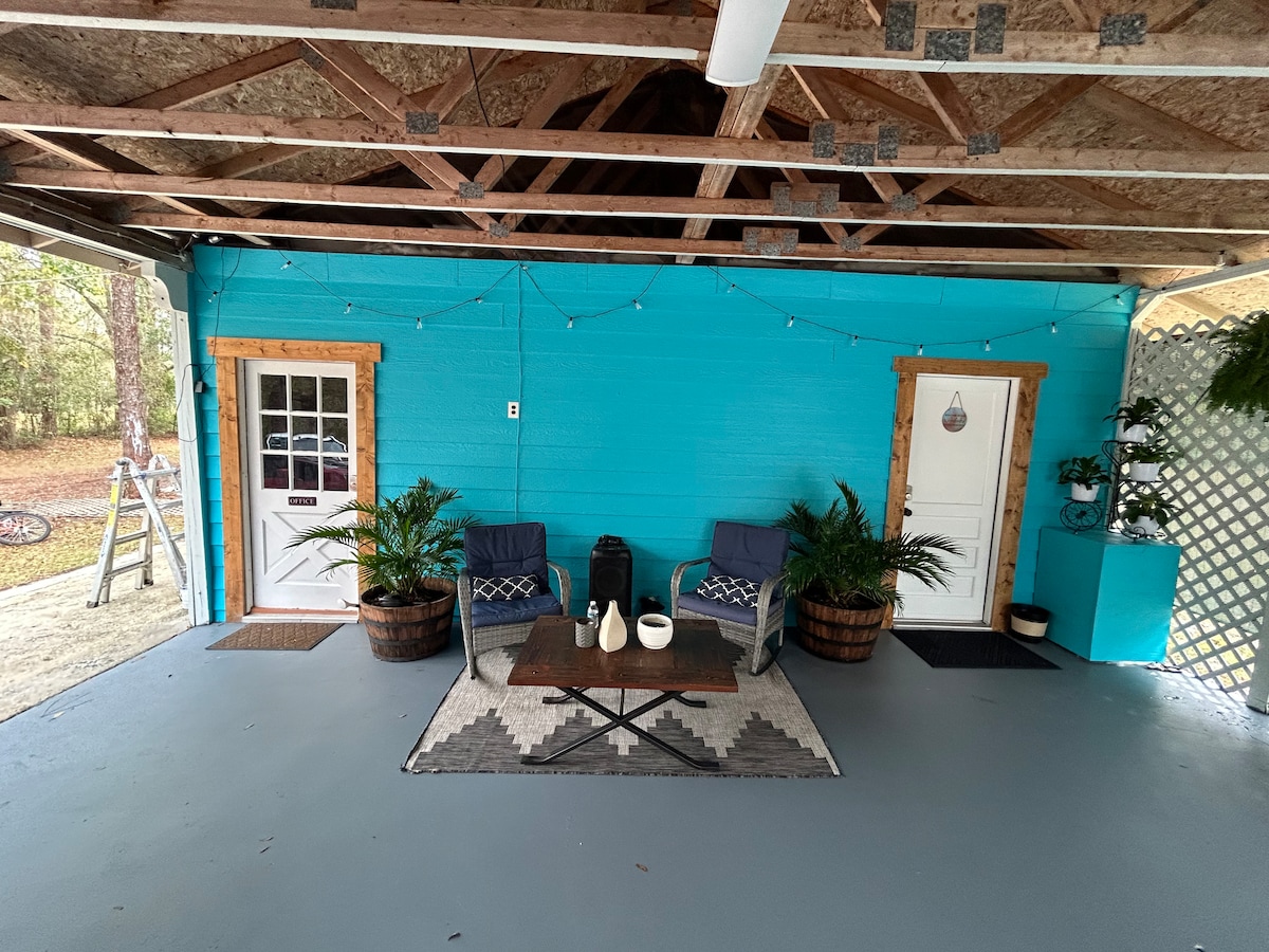 Take it easy at this unique and tranquil getaway. Whether you're here for a short stay or here to explore.... There's something for the princess at heart and for the adventurer. There's a comfortable hybrid mattress for two plus an extra memory foam mattress for two and a tent with a crib size memory foam pillow. Kitchenette is nicely equipped. A fireplace for ambiance under the TV. The bathroom has all the necessities with a walk-in shower. Relax on the patio under the sun and stars.