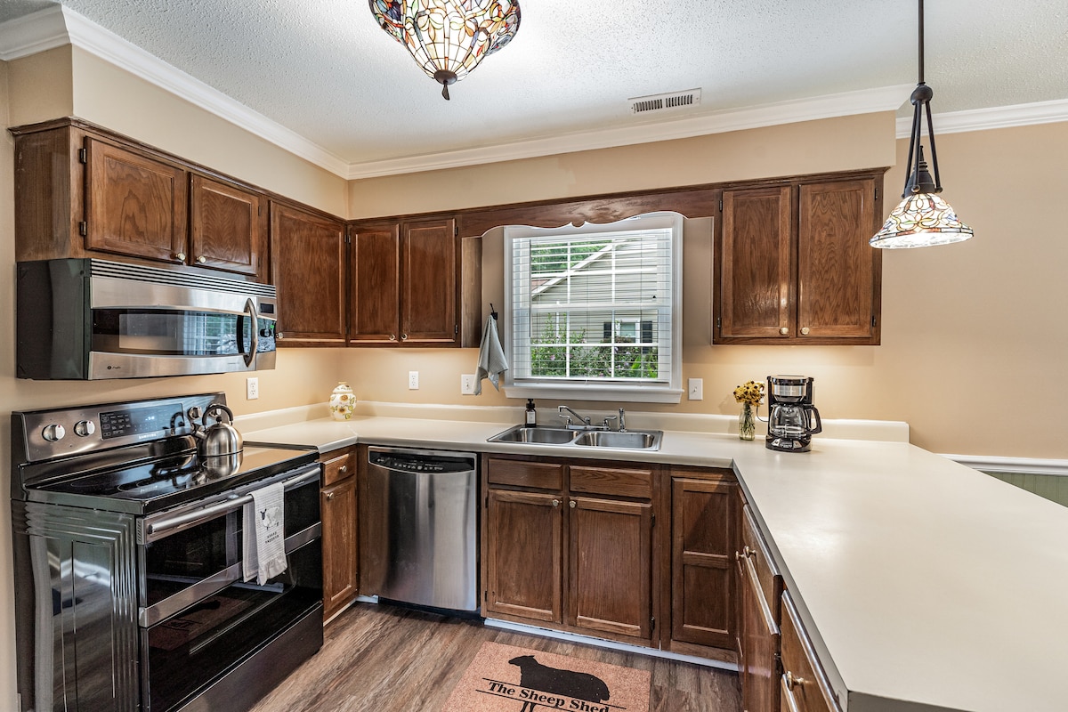 Starmount Forest is a quiet upscale neighborhood in the heart of Greensboro. Located just half a mile from upscale dinning and shopping In Friendly Center. This Spacious 2300 sq ft home features an inviting open floor plan with a large kitchen, den, living room and sunroom. The Kitchen is fully equipped with stainless appliance and everything you need to cook your favorite meal. New Furnishings throughout, master bath boasts large walk in shower, and every bedroom is equipped with a smart TV.