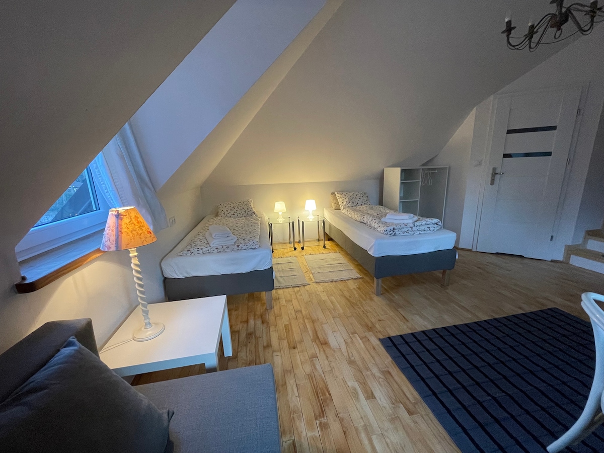 Welcome to our charming cottage, located just 35 minutes from the center of Warsaw, right next to Suntago - the largest water park in Europe. Our location is the perfect blend of picturesque surroundings, surrounded by forests and landscape park, with comfort, provided by a functional and modern home and accompanying attractions. For the exclusive use of: a hot tub, a large terrace, a fire pit, a barbecue area, a playground.