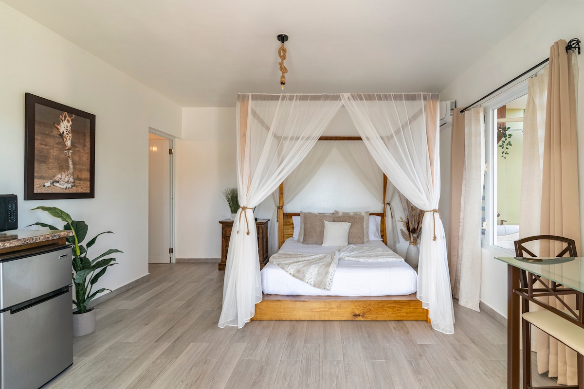Welcome to our charming beachfront studio! This cozy space is perfect for couples or solo travelers looking for a relaxing and comfortable getaway. As soon as you enter, you will be greeted with a comfortable queen size bed and a fully equipped kitchen with a cooktop (no oven) for you to create delicious meals. The studio also features A/C that cools the entire unit, ensuring you stay cool and comfortable during your stay.