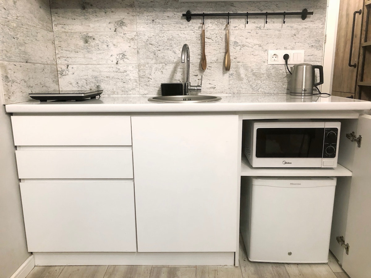 Apartment is located in New Gudauri few steps from Gondola. Charm of the apartment is ski in ski out. Apartment very cozy for little family or just friends. From balcony you will see glorious view of the beautiful mountains of Gudaiuri. This modern studio features a kitchenette with all entities, a seating area with coach( coach- bed), a flat screen TV with cable channels l and private bathroom with a shower and free toiletries.
