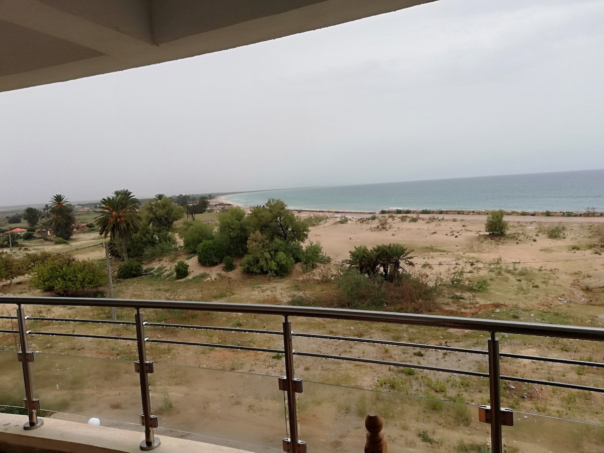 FOR RENT a furnished waterfront s+2 apartment 50m from the SINDBAD Hammamet Nord hotel, with direct private access to the beach (not a residence), a well-equipped kitchen, two bedrooms (sea view), a bathroom, a living room and a very large sea-view terrace. One breakfast include ( you have to choose the day )