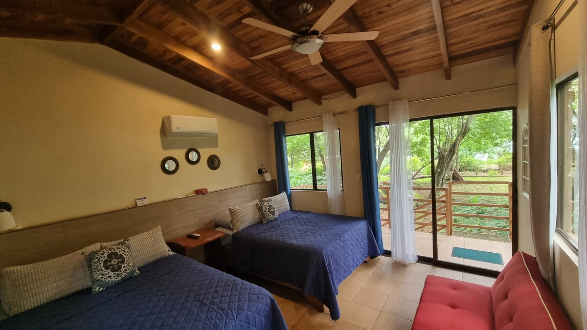 Imagine a luxurious family retreat nestled in Potrero, Costa Rica, offering a perfect balance of comfort and sophistication. The spacious room is adorned with sleek, natural finishes that reflect the region's tropical charm, such as teak wood accents and soft earth-toned décor. A large king-sized bed sits in the room, inviting restful nights after adventurous days. The room is cooled to your preference with efficient air conditioning, providing a refreshing escape from the warm Costa Rican sun.