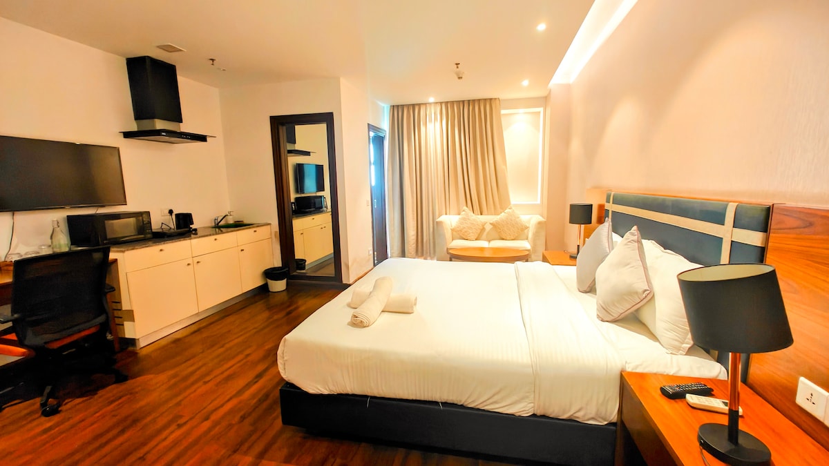 Indulge in the epitome of sophistication in this luxury studio apartment in the heart of South Delhi in Saket. Nestled in a prime location, Enjoy a tastefully furnished space, complete with luxurious decor and ample natural light. With a King Size Bed, Large screen 43" Smart TV, Fully functional pantry and a stylish washroom, every detail caters to a refined lifestyle. Immerse yourself in comfort & convenience. Welcome to a blend of luxury and urban living