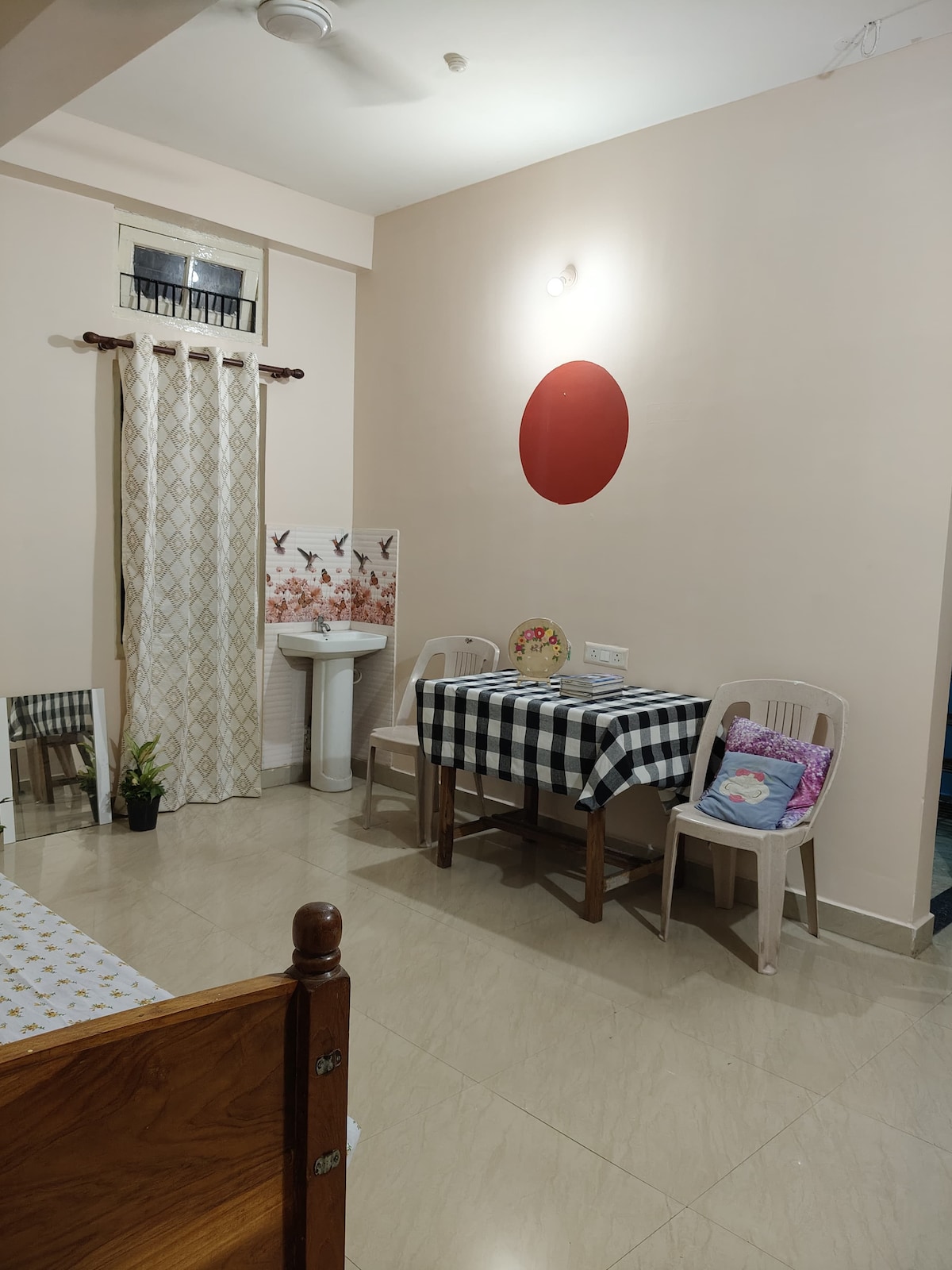 This 1bhk consists of a bedroom with an attached bathroom, a dining cum hall and a fully functional kitchen. The room is air-conditioned, and the bathroom has a geyser. It is on the ground floor with a separate entrance. Parking for one car/bike is available. Wifi available. Queer and couple-friendly space for guests who are 18 and above.