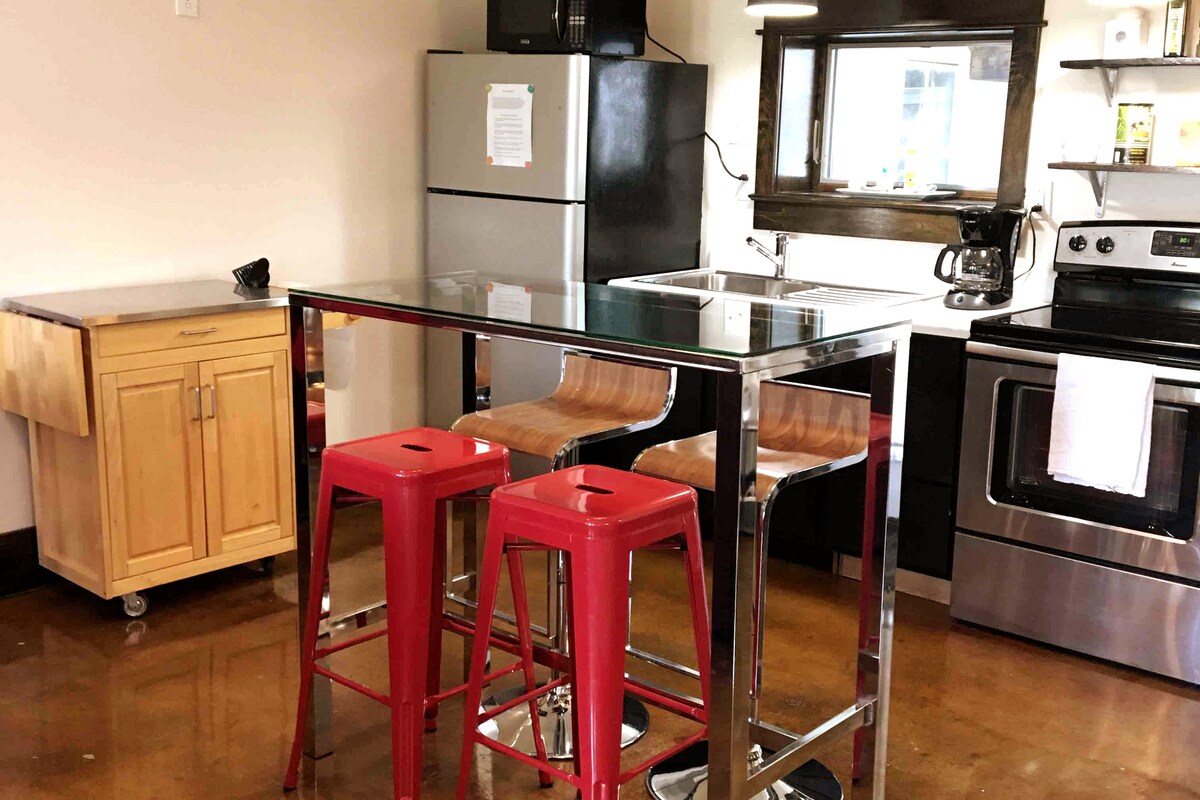 Who hasn't dreamt of glitter floors in their home? Well, my husband for one- but I convinced him to give me 400 sq ft to convert into a quirky, colorful, boho paradise. You'll have your own private entry/parking, & no need to worry about sharing space with us. You'll have a new queen sized helix bed, & if you brought friends-they can have the queen sized sofa bed. A kitchenette with retro fridge, microwave & basic utensils should suffice in heating up your yummy Nashville leftovers or take out!
