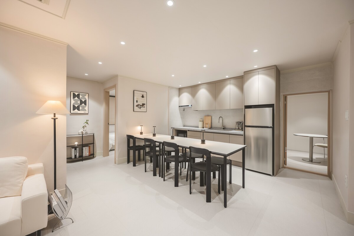 @stay8usanhang is a space overlooking Busan Port, thoughtfully designed to offer comfort and inspiration. Every detail, from music and fragrance to ambiance, interior, and bedding, has been carefully curated to enhance your stay. -Sky bridge connected to Busan Station (5-minute walk) -1 Super King bed, 3 Super Single beds Ocean-view bathtub (spa-ready) - Fully equipped / ideal for family travelers 50-inch large TV with Netflix, YouTube, OTT, and broadcast channels Bang & Olufsen speakers