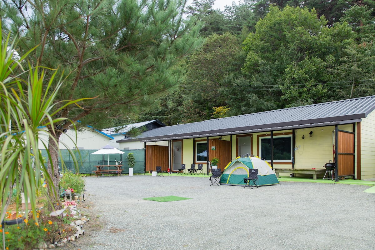 Host lives on the first floor, the guest accommodation on the second floor has a separate front door for guests. It is a place where hammocks are installed on the 495㎡ lawn, you can take a walk with pets, and provide optimal rest for those who want to rest quietly. If you bring barbecue parties and camping tools on the grass and balcony, (15,000₩ per barbecue) you can camp outdoors, pick up persimmons and chestnuts in autumn, and walk along the village trail (path) will also be a good memory.