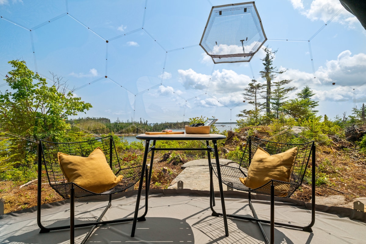 Experience the natural beauty of Nova Scotia through your own island oasis experience! Our upscale, cozy Geodesic Dome is equipped with everything you need with a view you will never forget. Enjoy a unique blend of nature and luxury as you explore the island during the day and relax in your own private Hottub under the stars at night. We guarantee this experience will be one you’ll never forget and one that you’ll keep coming back to time and time again!