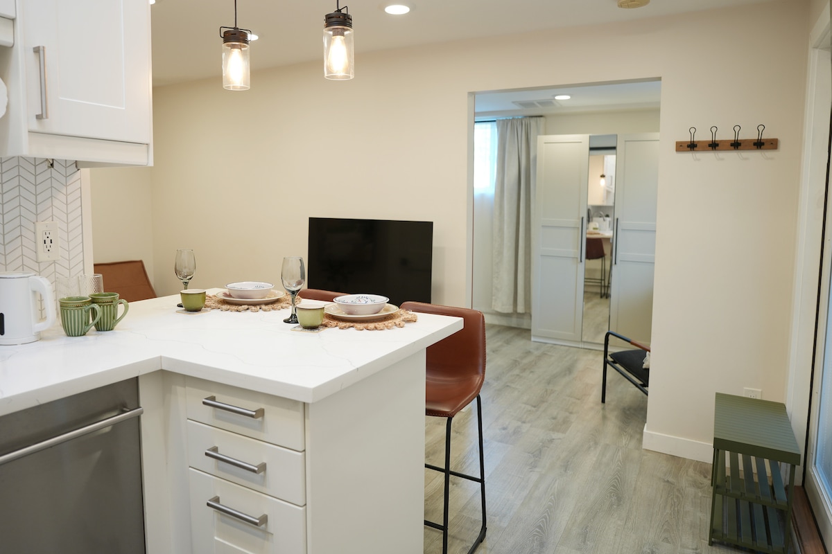 We have a compact but spacious-feeling 1 bedroom apartment that accommodates 4 guests with the addition of a full-size sleeper sofa in the living room. Open floor plan with the kitchen and living room. It offers a lot of windows and daylight with skylights in the kitchen and shower. We have a lovely west facing balcony that overlooks the the garden and provides territorial sunset views. It offers Northwest/Scandinavian modern design and a clean feel.