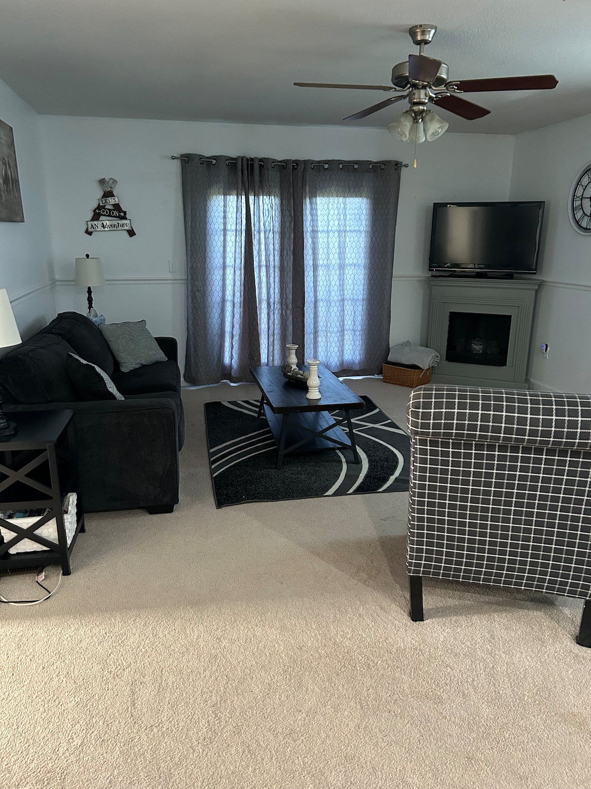 The spacious living room features a neutral carpet and light-colored walls. A cozy seating area is provided by a brown sofa and a cream armchair. Natural light filters through two windows adorned with sheer curtains. A decorative fireplace adds character to the room.