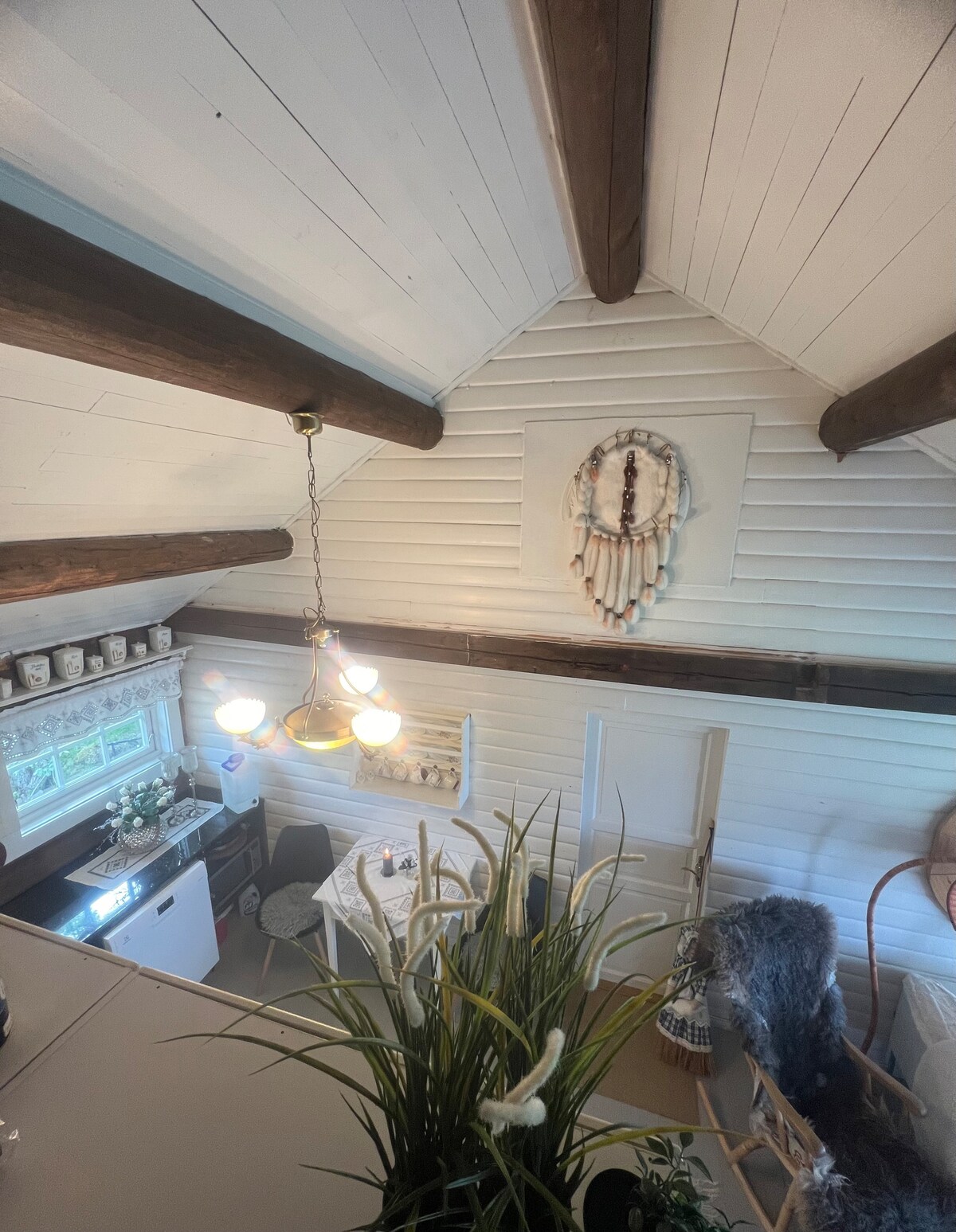Bright and pleasant cabin of about 45 sqm. 1 × 150 cm bed and single bunk bed. There is an extra mattress and bed in the loft. Mini fridge in the kitchen. Washing machine and freezer in the storage room. Toilet, sink and shower in the bathroom. Gazebo on the mountain by the sea. Large lawn with playground and trees to attach hammocks to. Small gas grill that can be used. 2 bicycles that can be used. Outdoor toys and games for children are also available.