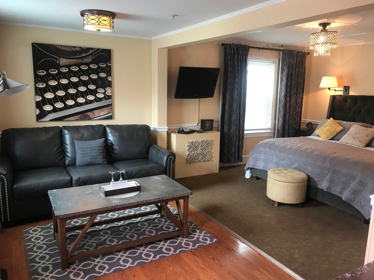 Experience the style of a downtown boutique hotel, with the comfort of a country inn. Stay and play in a beautiful waterfront town at the award-winning Vandiver Inn, located just blocks from the Chesapeake Bay in historic Havre de Grace, Maryland. Surrounded by historic homes, museums, and close to golf, shopping, antique stores, marinas and water-oriented activities, the Vandiver consists of the Historic Vandiver Mansion, the adjacent Kent & Murphy Houses, the year-round Pavilion and our Gardens.The Young (Premium / 1st Floor Kent House): Memory Foam King bed, plus small window seat in sunlit windows. The room also has an antique built in rustic storage unit and larger jetted tub with shower. Private entrance. Special Stuff: (large) Jetted Tub / Microwave & Mini-fridge / King Bed.