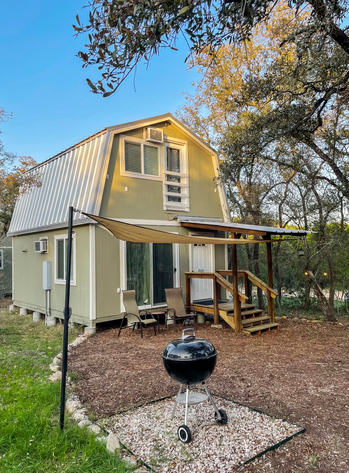 As seen on HGTV! "My Tiny Cabin" is a complete house in 288 square feet, built as an experiment in simplification by CJ "Ceige" Taylor, situated under oak trees on a 1.5-acre working neighborhood mini-farm. Stay in a real Tiny House on Wheels while you visit nearby Driftwood or Dripping Springs, drive into Austin or San Marcos, or enjoy the Texas Whiskey Trail (Crowded Barrel, Fang & Feather), wedding venues (Chapel Dulcinea, Tuscan Hall), the Wizard Academy, Radha Madhav Dham, and more.