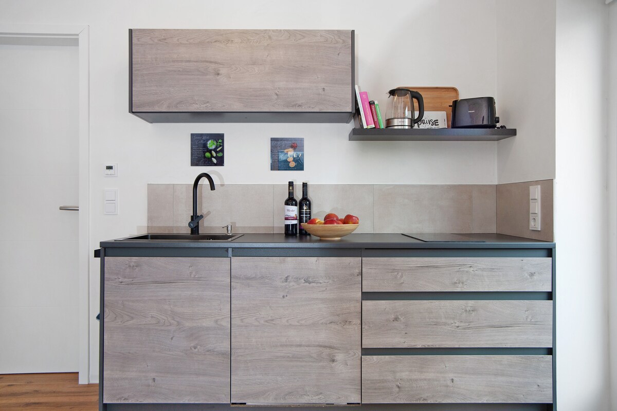 Modern apartment right on the Lech. The apartment consists of a modern kitchen , a bedroom (double bed), a bathroom with shower and toilet, and an entrance area with a cloakroom. The apartment is set back in the courtyard/garden or on the Lech and completely on the 2nd floor. Above the Lech you can enjoy a romantic view of the former monastery of St. Mang and the High Castle at your feet. Shopping, strolling, dining out... possible without transportation.