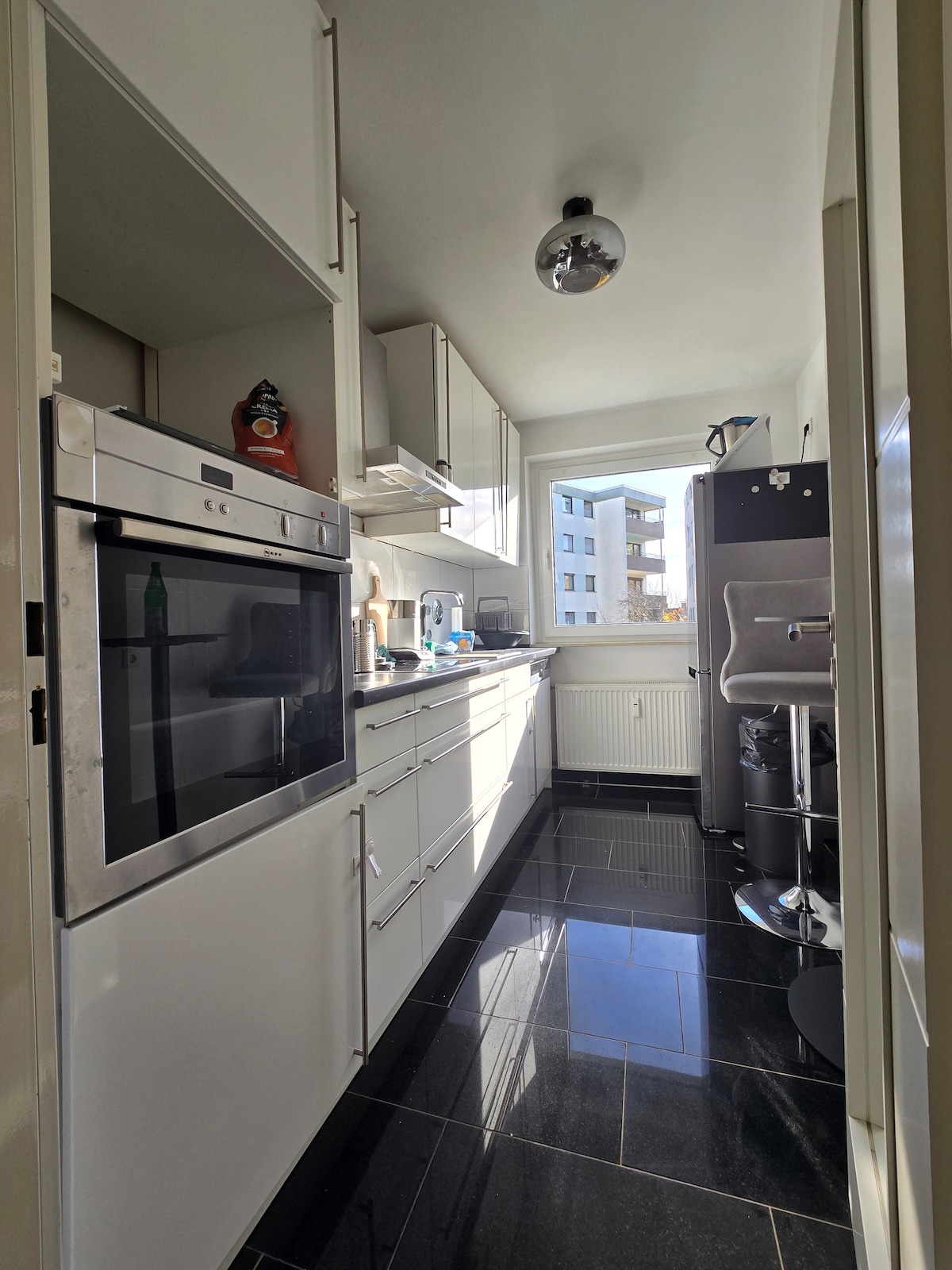 This spacious, loft-style flat is centrally located between the popular Schanze/Altona districts – right in the heart of the action, yet quietly tucked away in a green courtyard. The bedroom offers a relaxing retreat, while the living/working/dining area with its own tea/coffee station invites you to linger. The large terrace with seating area is a wonderful place to relax. PLEASE NOTE: The entrance area (living/dining area) is passed through when coming and going, and the kitchen is shared.