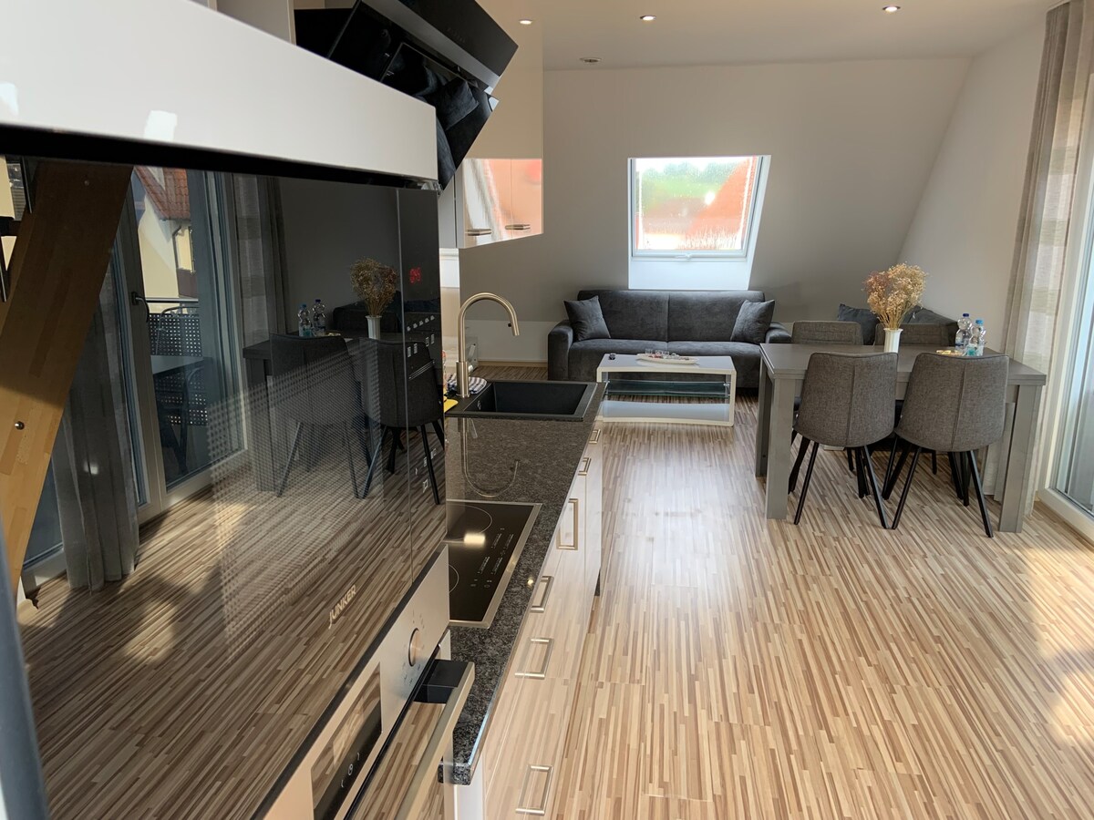 Kick back and relax in this calm, stylish space. There is a lot of room for up to 4 people, areas to relax, cook or work. Feel free to use the PlayStation or the electric sit/stand desk for home office activities. The loft is not far from Aschaffenburg, Frankfurt, Wertheim Village or Wuerzburg. All can be reached in max 50 minutes or less. Also, Spessart forest starts right behind the loft, a lot of walking and biking opportunities can be accessed from Waldaschaff and from the loft.