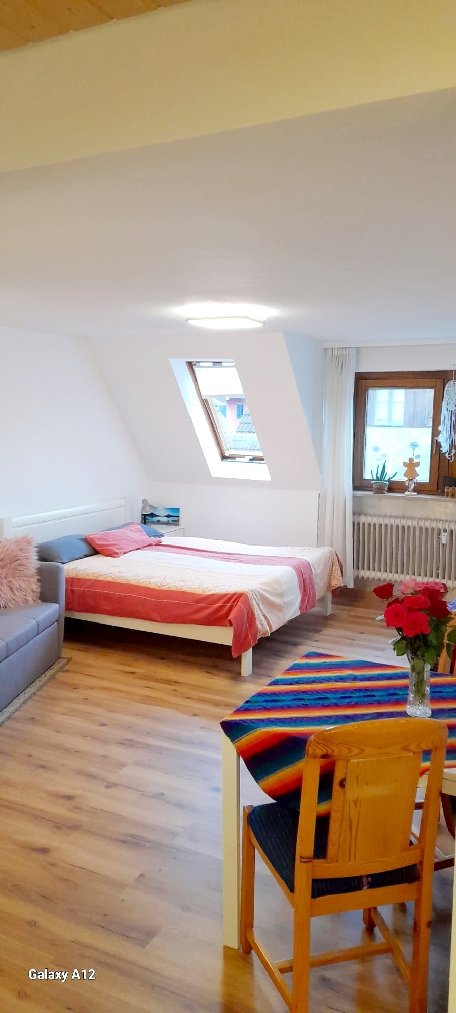 Willkommen am Fuße der Schwäbischen Alb. Die Ferienwohnung ist neu renoviert und im hellen modernen Stil eingerichtet. Es ist ein großes Zimmer mit neuer Küche, einem Doppelbett und einem Schlafsofa. Es gibt ein modernes Bad mit Dusche. In einem kleinen Zwischenraum ist eine Waschmaschine. Ein Trockner kann bei Bedarf genutzt werden. In der Küche befindet sich eine Kaffeemaschine, ein Kühlschrank mit Gefrierfach sowie einer Mikrowelle.