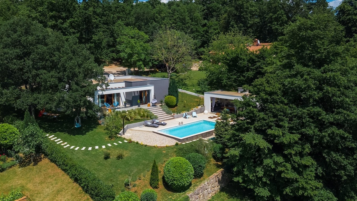 Forget your worries in this spacious and serene space. Brand new, 2- bedroom villa with a sunset view and 35 m2 big private pool, is perfect for your relaxing vacation. Villa Aquila is set in a small Istrian village, a 10-minute walk to the medieval Benedictine monastery and half an hour drive to the Seaside and to the coastal town Rovinj.