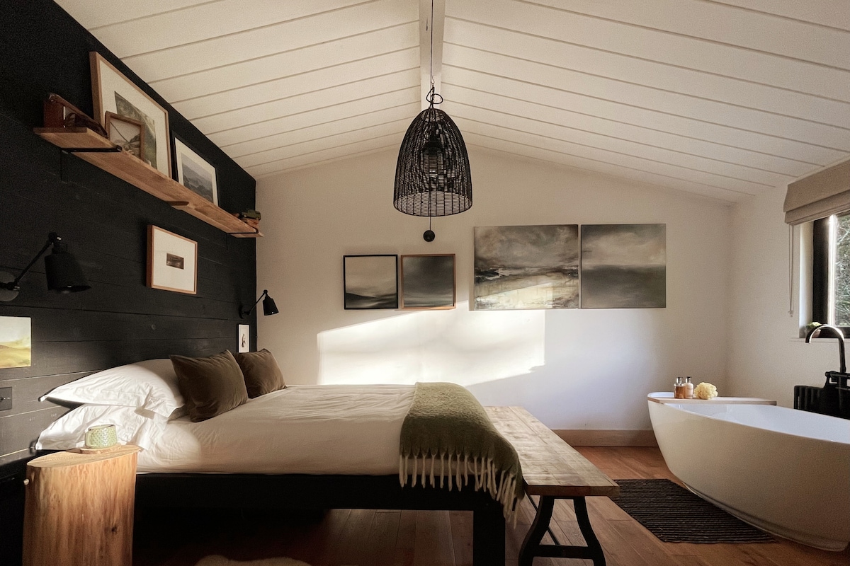 A calm, deeply luxurious space to recharge & reconnect. The Shippon is a meticulously converted cow barn with heated, polished concrete floors, gently curving deep green walls, hand-built kitchen, warmly lit reading nooks, & natural materials. Woollen blankets, feather sofa, antique Scandinavian log burner, king-size bed with French linen & down, waterfall shower, & the softest towels. Our sleepy Devon hamlet is only lit by stars at night. You might just sleep better than you have in years.