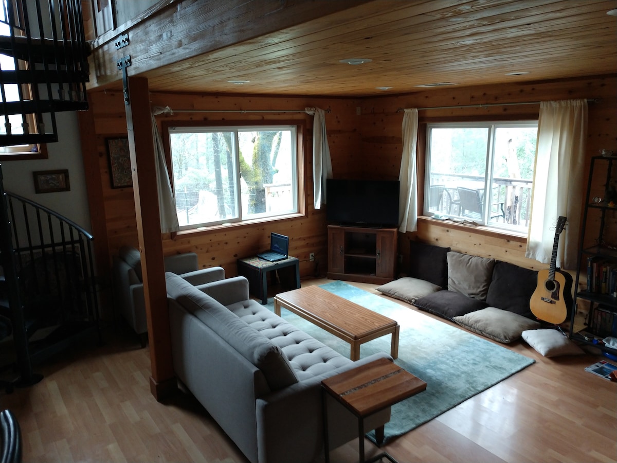 Unique custom built mountain cabin available for working remotely, hiking, mtn biking, rafting, fishing or quite retreat. Five minutes to the Trinity River, and 5 minutes to a local meditation retreat center. Fast and steady wifi supports multiple zoom calls. High capacity Level 2 - 40 Amp EV charger installed in driveway. Pet owners please note: there is poison oak in the yard, so pets should probably not roam freely. There is small fenced enclosure with no poison oak.