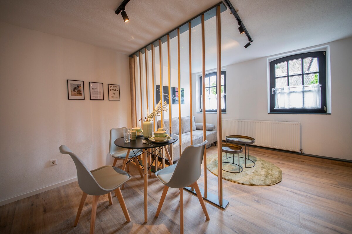 → 135 sqm stylishly renovated barn → Wood-burning stove → Sauna → Whirlpool bath with massage jets → Fully equipped kitchen → Large living and dining area → Terrace with garden furniture → Canopy bed on the 1st floor → Check-in via smart lock → 75 inch large Smart TV → Free Wifi → Gas grill → Digital travel guide → Board games for game night → Wine fridge → Kronenburg castle ruins & hiking trails nearby