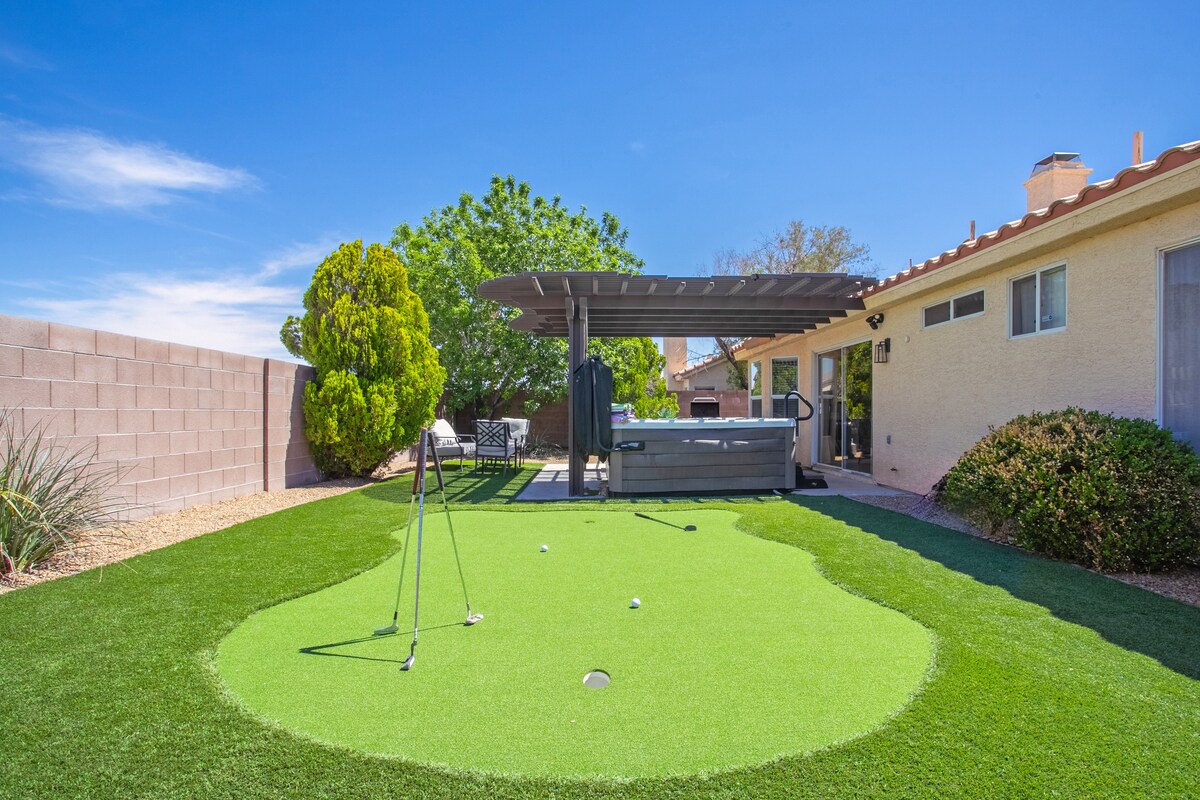 4 bedrooms (1 King/3 Queens), 2.5 bath/ 2200 sq ft home with pool/spa and putting green (pool heat xtra). Games room, well stocked kitchen, living room with 60” smart TV, beautiful heated pool & relaxing spa. Waterfall, & putting green help you enjoy beautiful Henderson in the Mission Hills area. 20 min drive to Las Vegas strip or Boulder City. Outdoor space includes lounge chairs on newly resurfaced pool deck, outdoor table with seating/ lounge area on covered patio. See details for more info.