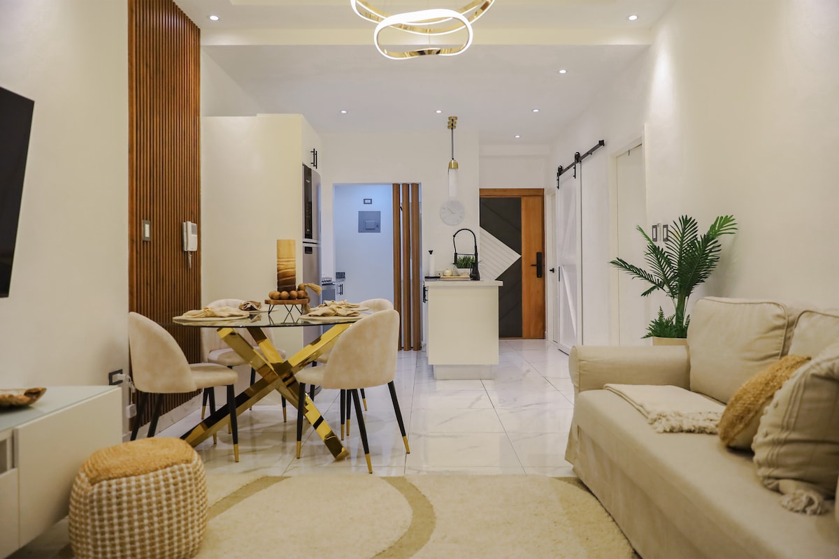 Rodéate de estilo en este destacado espacio. Nuevo apartamento ubicado en el 5to Piso con vista al centro de la ciudad de Santo Domingo. Cuenta con amplia habitación equipada con todas las comodidades para el descanso de nuestros huéspedes; cama King, TV Smart, Aire Acondicionado, Amplio closet, entre otros. El apartamento cuenta con internet de alta velocidad, aire acondicionado central, espacios de trabajo, balcón, cocina equipada y cómoda sala de estar.