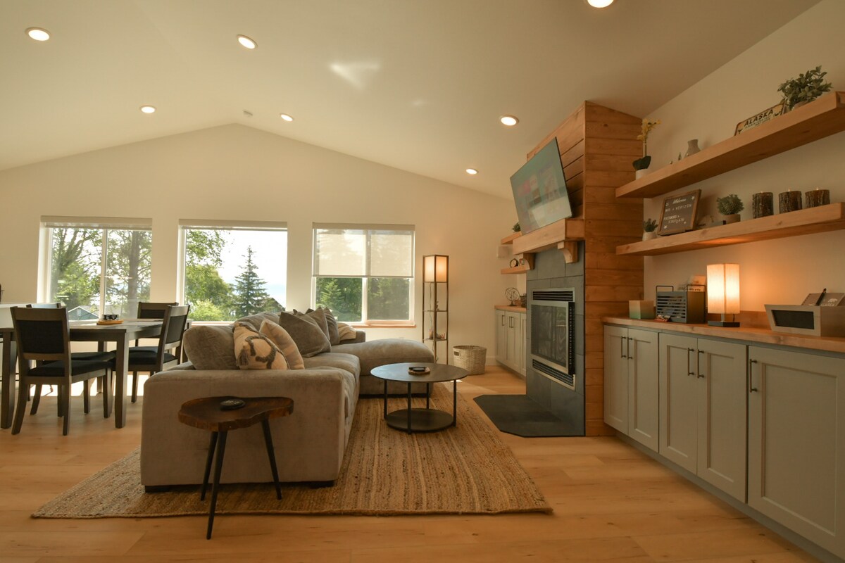 Please come and enjoy our modern and unique vacation getaway! 3 minutes from downtown Homer and 10 minutes from the Homer Spit. Close to town in a quiet neighborhood with views of Kachemak Bay. -1 King size bed -1 bathroom with rain shower head -Open concept living area -Modern natural gas fireplace -Smart TV -Full kitchen -High speed wifi (50mbps) -Free parking -Key code access -Nordic Spa with hot tub, sauna, and cold plunge