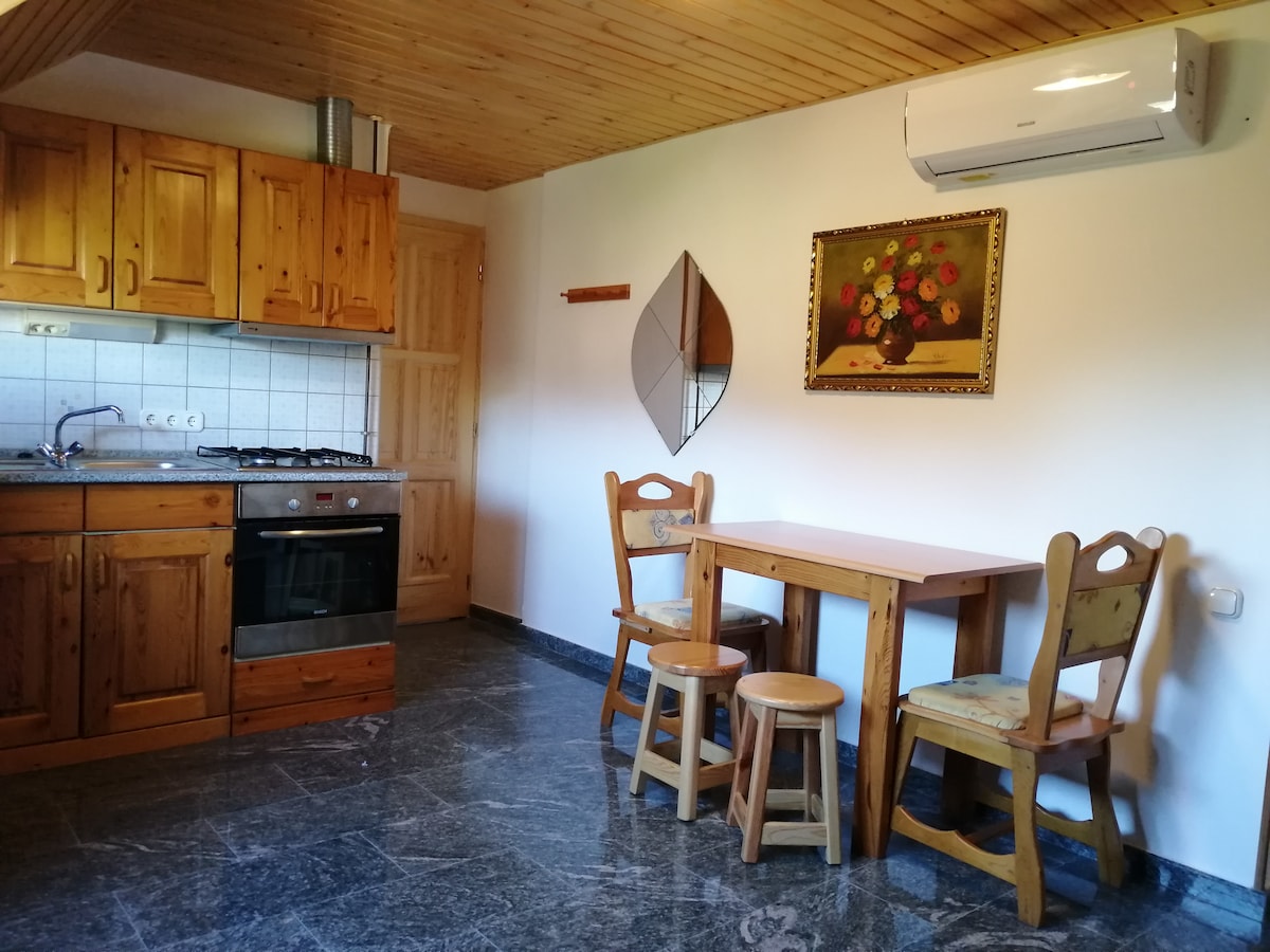Spacious studio with a large comfy bed, safe, air conditioner, flat TV (up to 500 satellite programs), Wi-Fi. Fully equipped kitchen with a soft corner. Toilet with shower and washbasin. A large terrace with sunbeds, awning, tables and chairs. Garden view. Quiet place A large area with a gazebo and parking lot. Lots of greenery. Possibility of hiking and cycling. Nearby, there is a restaurant, a therapeutic center, playgrounds, water and play entertainment.