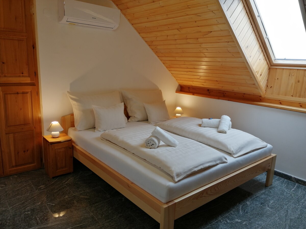 NTAK registration number PA20008656 - Casa Ninfea Pension 55m2 upstairs panoramic apartment. Sleeps 2+2. 1 bedroom with double bed, separate shower and toilet. Living room with sofa bed for 2 people. Fully equipped kitchen with fridge, dining room. Panoramic terrace with garden furniture. Color TV, individual heating, wifi, air conditioning (extra charge).