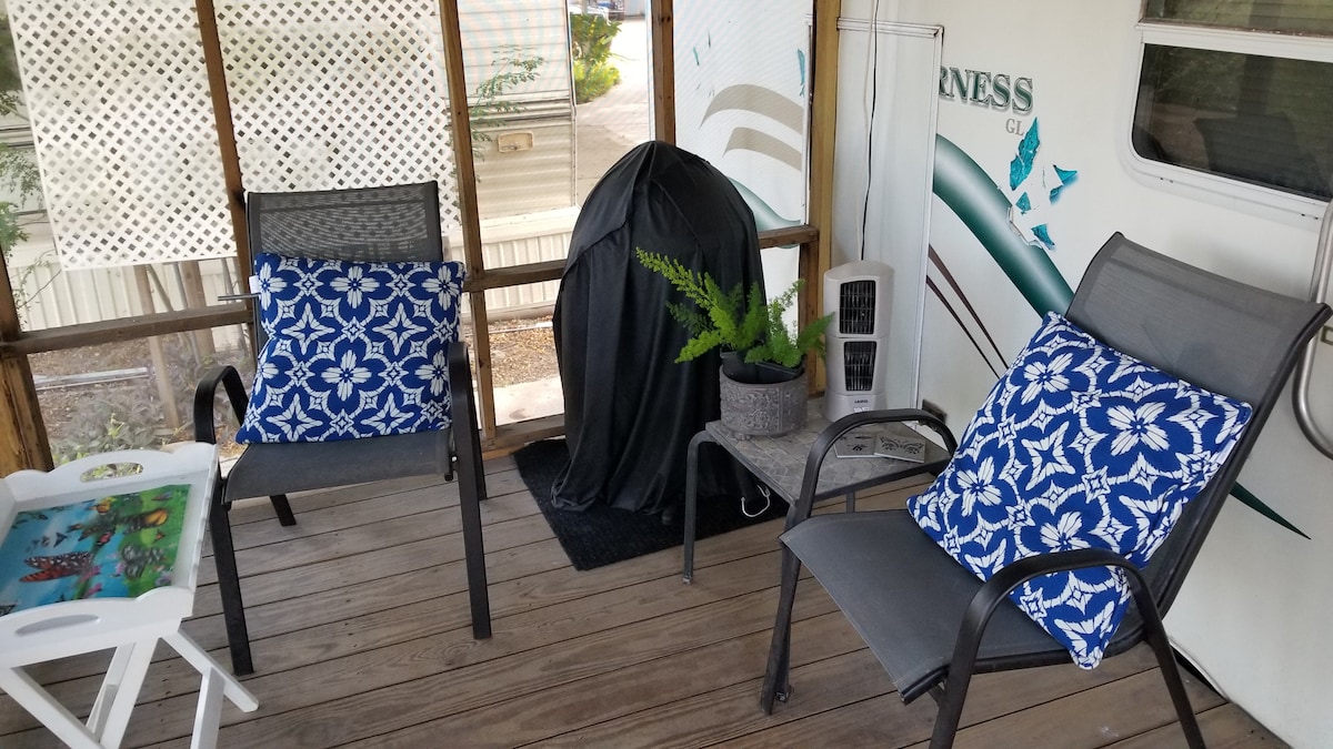 A 5th wheel, this space is a beautiful place and is anything but ordinary,; for those who appreciate the finer things in life. Roomy, furnished with everything you need. King size bed and queen hide-abed sleeps 4 comfortably. It’s in a quiet residential neighborhood in a fenced in yard. A few blocks from small stores and laundromat and a few miles from Walmart and dozens of restaurants and stores