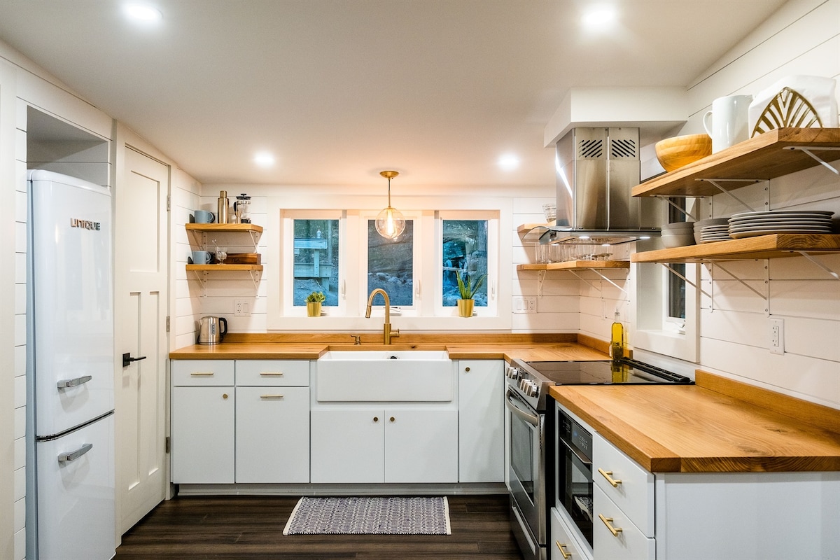 Wake up to one of Lancaster's most unique views: a 19th-century grist mill and covered bridge visible from your lofted king bedroom. The Rockmill Cottage, a one-bedroom guesthouse built entirely in craftsman woodwork, is warm and full of character. Perfectly positioned between vibrant downtown Columbus and the caves and waterfalls of Hocking Hills State Park (each about 35 minutes away), the cottage makes an ideal base for weekend adventurers — or a peaceful escape all on its own.