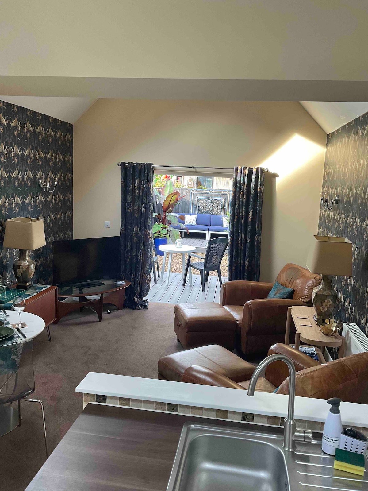 1 bed studio over garage, accessed via 13 external stairs. Decking, garden furniture. Overlooks surrounding countryside. Kitchen, shower room, king size bed, seating area. Microwave, oven, induction hob, breakfast bar. Numerous sockets. 2 USB ports. TV using internet & Apps. Couples/singles only. Internet via 4G, we are rural can drop out. No babies/small children. Excellent location for Cotswolds/Swindon. Free off-road Parking. Check in 1500 Out 1100. No pets. No smoking.