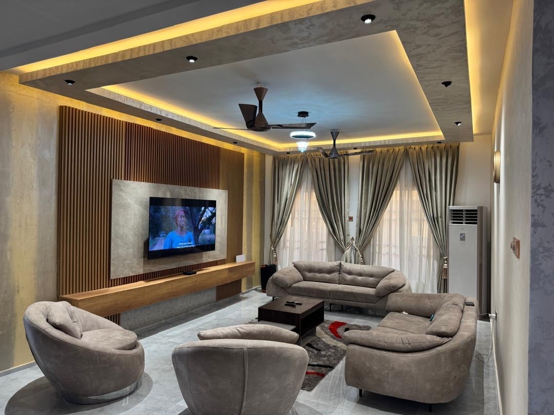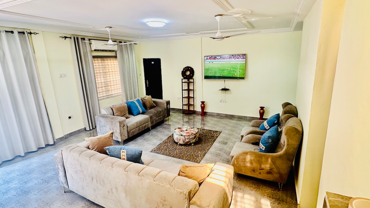 Modern 2-bedroom Airbnb in Ho with ensuite master, second bedroom and bathroom. Ideal for families, couples, and business travelers. Features bright living room, TV, WiFi, fully equipped kitchen, secure compound, free parking, 24/7 water, and a private fish pond offering a peaceful, unique atmosphere for short or long stays.