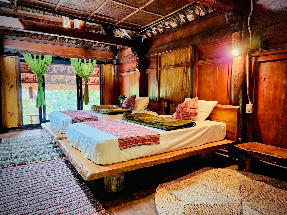 The wooden room is located on the left side of Ms Tien's family home, offering both privacy and close proximity to the host family. The room is designed with wooden materials and a traditional palm-leaf roof, featuring one bed on the first floor and a loft bed, suitable for a small family of four or a couple. Outside the room is a spacious yard facing the garden with a small tea table, providing a peaceful space for the whole family to enjoy the morning air and sunlight.