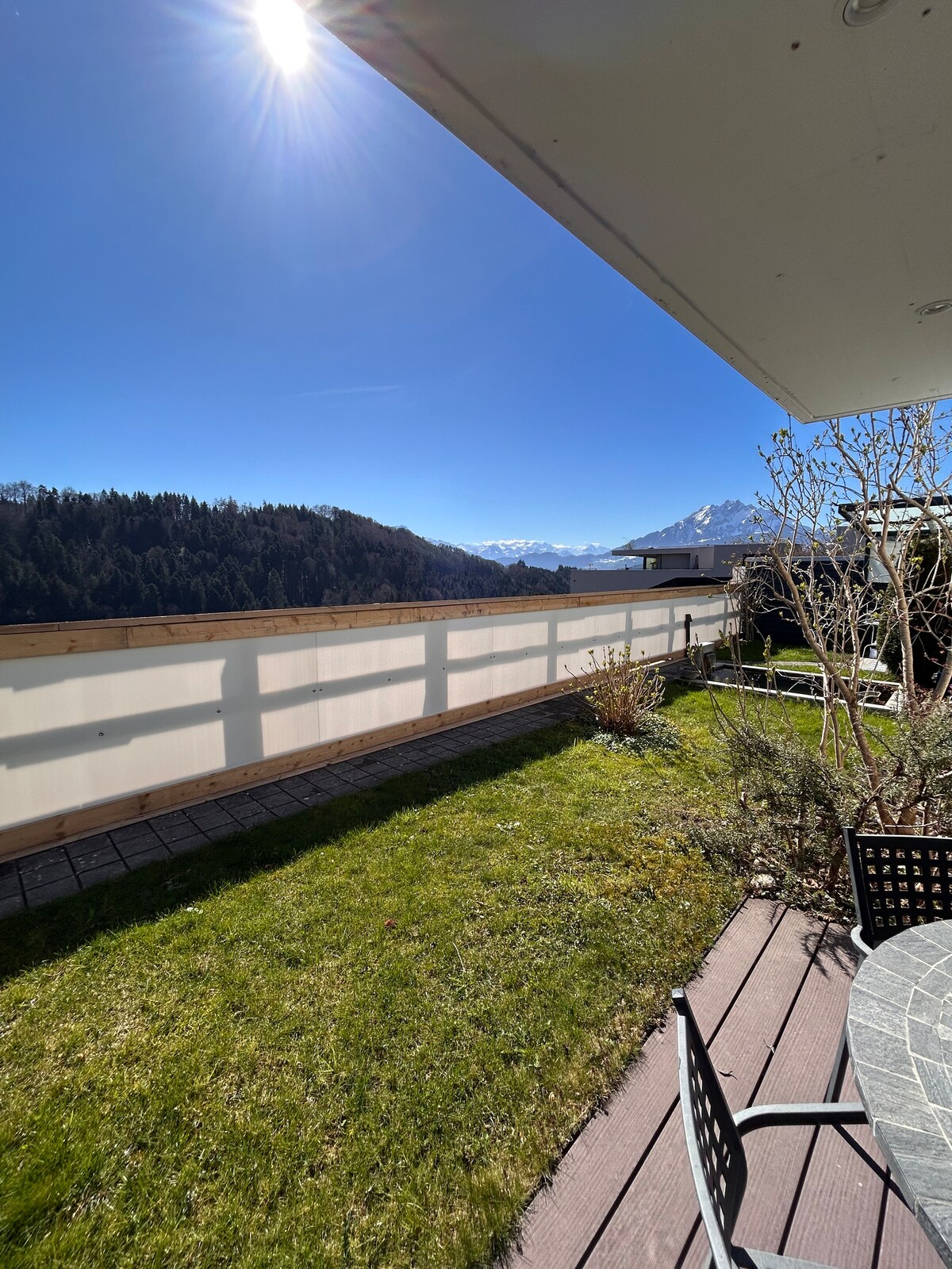 Sunny room in a quiet residential area with toilet/shower. Small kitchen, fully furnished. Covered, sunny seating with electric grill and great views. Private entrance, parking in front of the house. Approximately 200 m to the bus stop. Our modern single-family house is easily accessible from Lucerne main station in 12 minutes by bus.