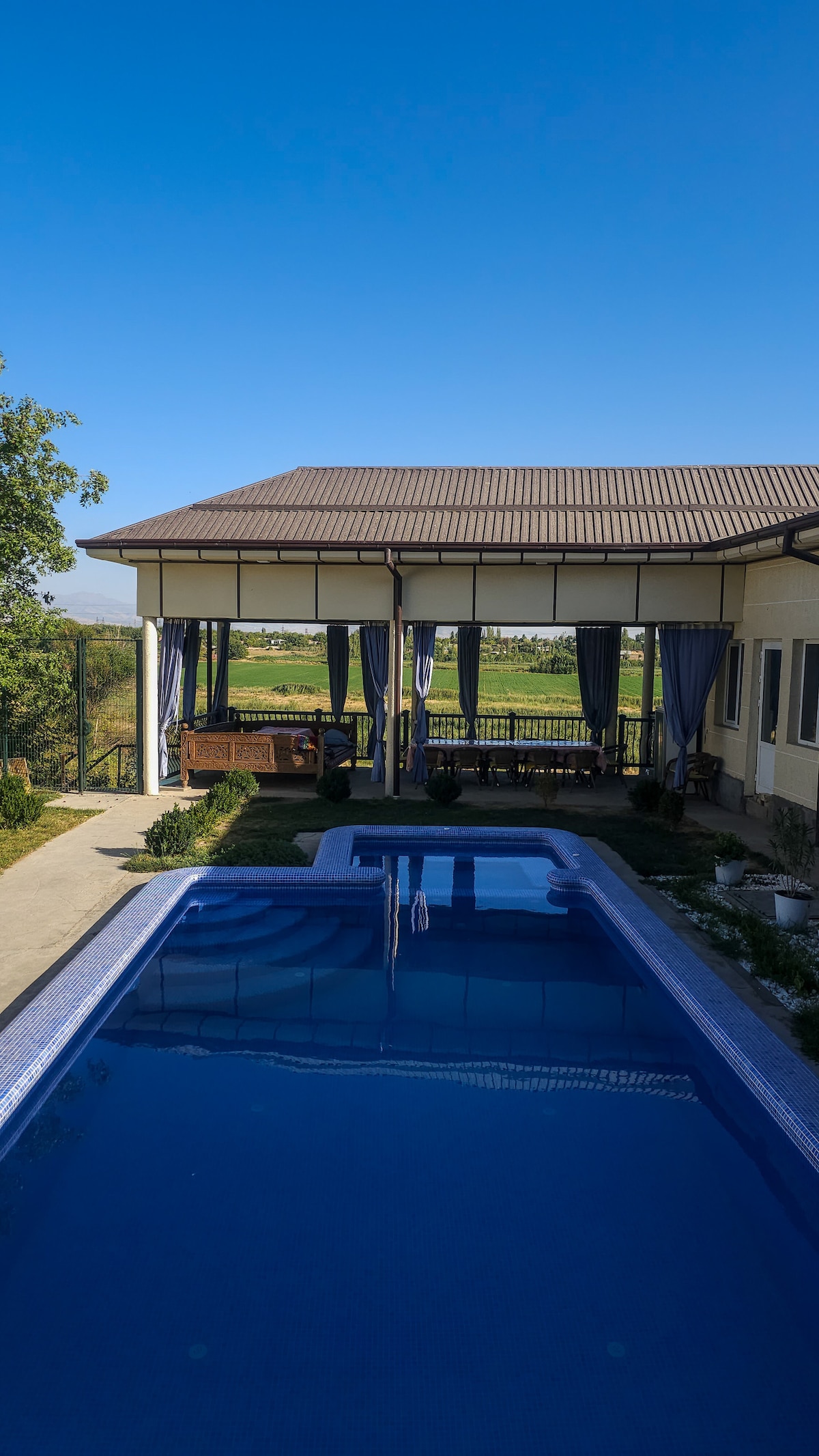 Forget your worries in this spacious, secluded home. The house is located at the foot of the Chatkal Ridge in the Charvak area. The house overlooks the Ugam mountain river, which originates in the upper reaches of Akburkhan. While relaxing in our house, you can use the pool, sauna, open fireplace and cook food on the fire.