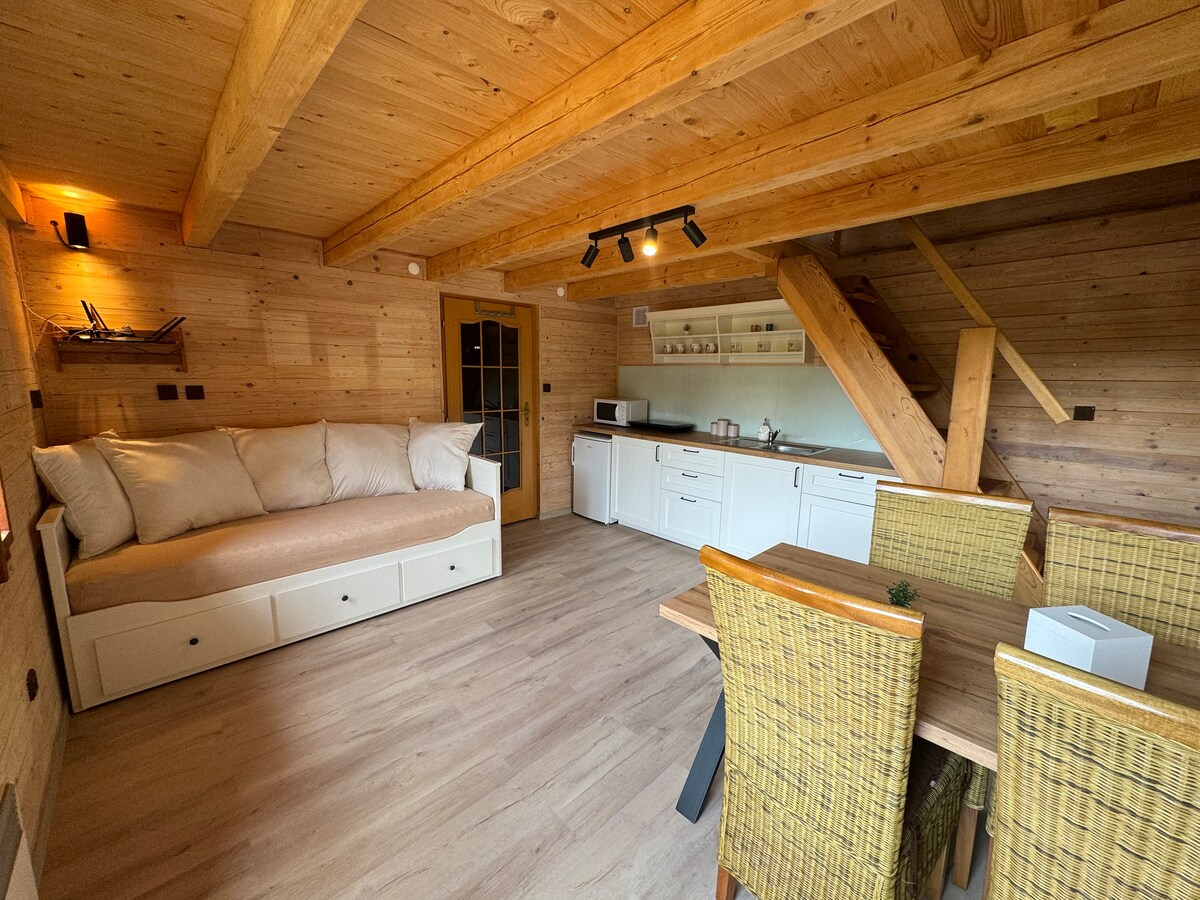 We built our mini house Pod Ořechy to maintain the maximum possible level of privacy and tranquility. It stands right next to a sheep enclosure and has a wonderful view of the forests and meadows. The cottage is small, but thoughtfully designed. It is located on a fenced property so that your four-legged pets can come with you. On the property you will also find a private Finnish wood-burning sauna with a romantic view, which you can use without restrictions. Inside you will find a comfortable bed, a full bathroom and a kitchenette.