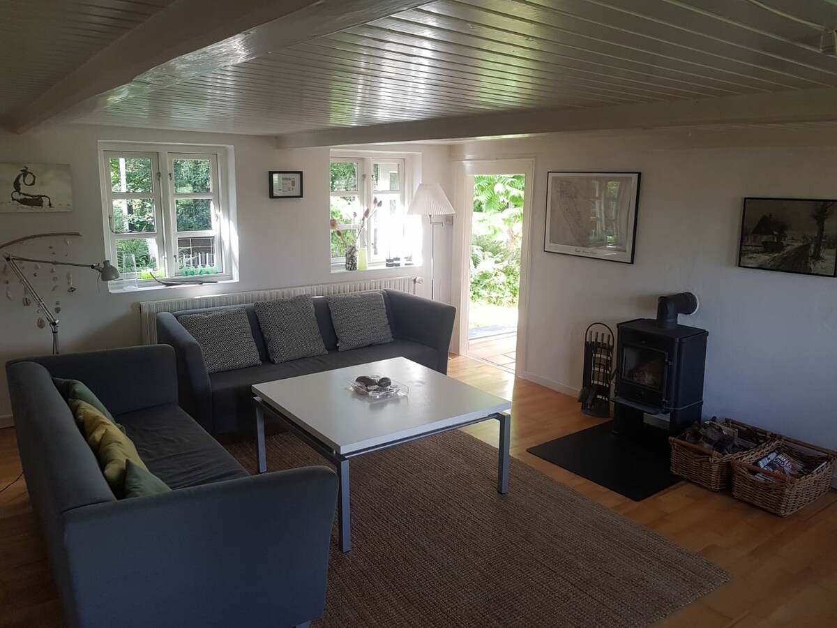 NOTE! The stay includes bedding, towels + final cleaning! NEW: ELECTRIC CAR CHARGER at the house! Beautiful cottage on the beautiful and quiet northwest-facing coast of Mols. All the indoor details have been taken care of and a rare stylish and atmospheric interior has been completed in the small simple house from 1978. It is flooded with sun from the large green garden with both south and west-facing terraces and there is only a 100-meter walk to the sea view, as well as a beautiful hiking trail in the forest edge on the edge of the slope to the sea.