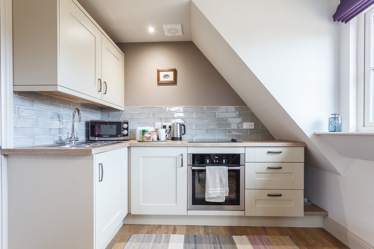 The garden annexe to Coopers Farmhouse. This self-contained unit is upstairs, above our garage, with a balcony overlooking gorgeous fields and garden. You enter the living room with a mini-kitchen, TV and sitting area and sofa bed (king). Through an archway (no door) and in the bedroom the twin beds can zip together and be made into a lovely big double if required. Finally, an ensuite shower room. A small continental breakfast will be left for your first morning's stay.