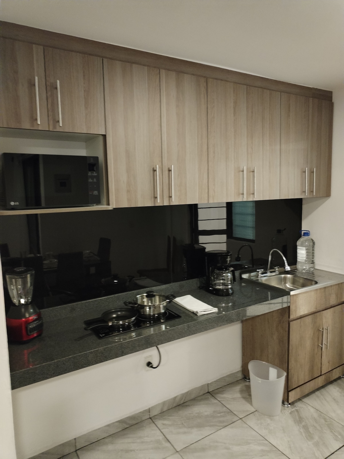 Hermoso Departamento con amplia terraza, limpio y muy acogedor. la construcción es nueva, así como los muebles que hay en su interior. el departamento es de concepto abierto, solo hay un biombo que separa el área del dormitorio con la sala, para dar un poco de privacidad. Hay un sofá cama, tamaño matrimonial, en la sala El departamento tiene amplias ventanas que brindan una excelente iluminación. y cuenta con una linda terraza, rodeada de plantas.