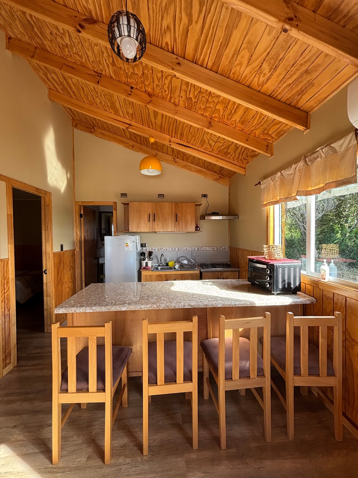 Pichi Cucao is a 13 m² cabin, ideal for couples or solo travelers exploring Chiloé. Its minimalist design invites you to enjoy the silence of the forest. Functional and bright, with a large terrace. It has a double bed next to a large window, a fully equipped kitchen, a private bathroom with hot shower, and air-conditioning heating with remote control. Located next to the Café del Bosque café-restaurant and right in front of Lake Huillinco, with direct access to the lakeshore.
