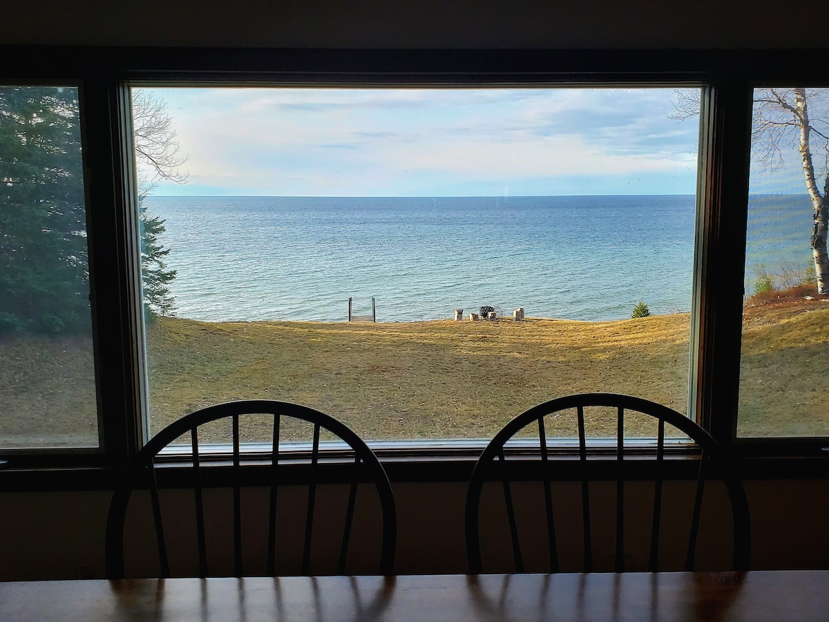 This spacious family home is located right on beautiful Lake Superior beachfront. After playing on the beach, enjoy sitting in front of a warm fireplace and hang out playing board games and Foosball, or painting. Upstairs is a large livingroom/dining area with a spacious kitchen and an amazing view of the lake. Sit and watch huge ocean freighters go by, binoculars provided get a closer look! Amazing views of sunsets, northern lights, and stormy weather. NO CLEANING FEES!