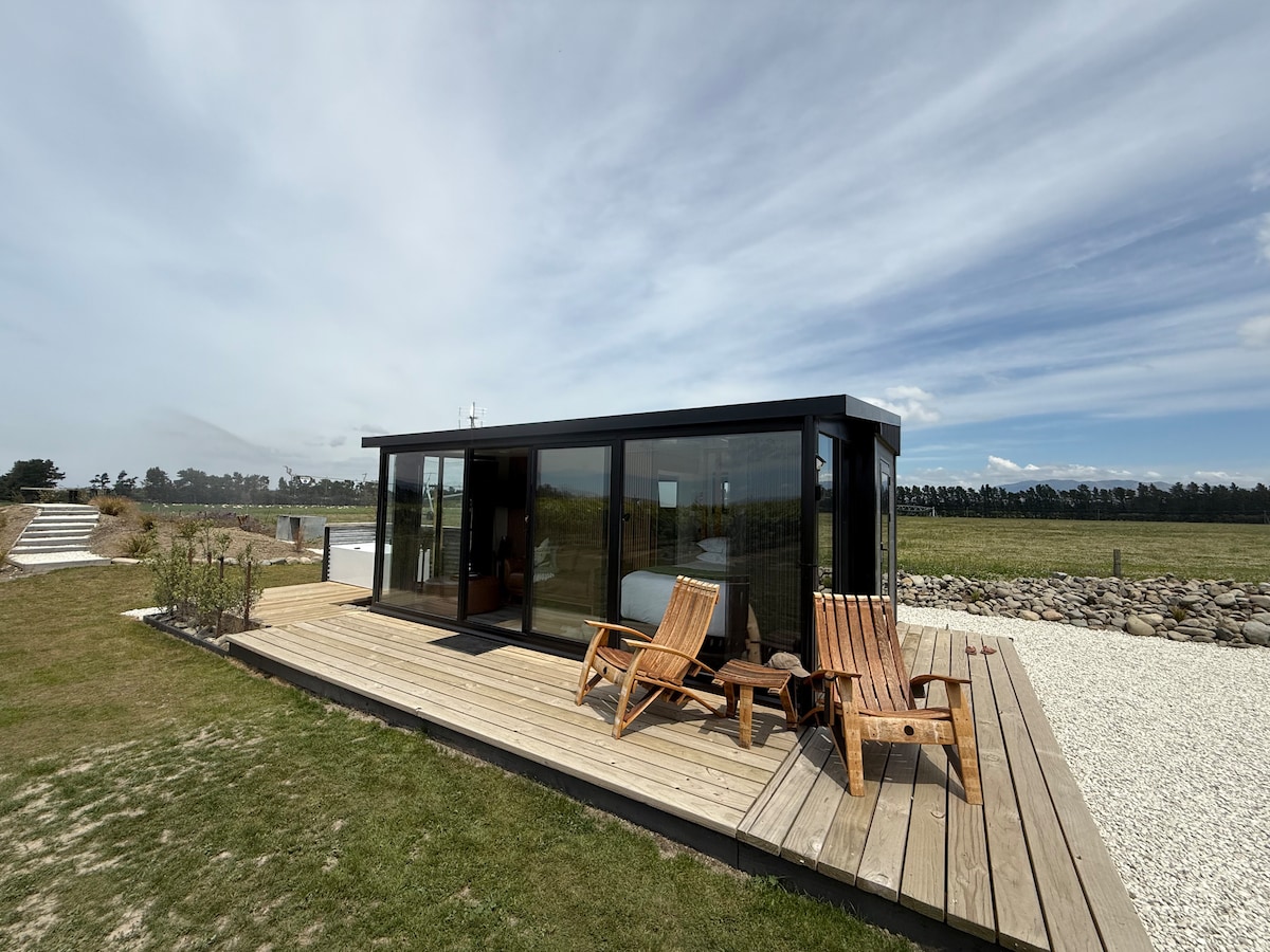 Luxury Alpine Villa: Your Private Hanmer Springs Oasis. Escape to exclusive modern luxury amidst stunning mountains. Unwind in your private outdoor hot tub under the stars. Enjoy a lavish Super King bed, premium linens, and breathtaking mountain views right from your pillow. Features a cozy living/kitchen area and a modern en suite with a bidet. Perfect for romance and total relaxation.