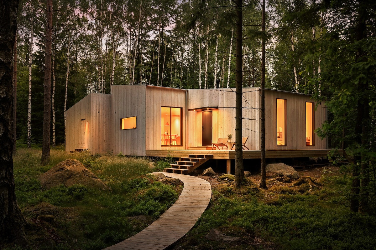 Welcome to a peaceful and unique accommodation in the middle of the woods outside Oskarström. Here you live completely secluded, surrounded by silence, birdsong and fresh forest air. The house is newly built in bright Scandinavian design with modern amenities and an atmospheric fireplace. A forest lake with a swimming area is just a stone's throw away. Close to hiking, nature reserves, mushrooms and berries – and only 30 minutes to Halmstad where some of Sweden's finest beaches are located!