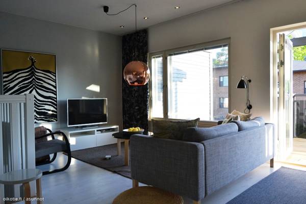 Petsamo Apartment is fully equipped, light and spacious upper floor apartment in a private wooden house. Two bedrooms and a big open space for kitchen and living room with two sofa bed. About 80 square meters, accommodates max 7 persons. Own entrance, free parking and free use of the patio with grill. Situated in green and quiet environment, 700 meters to the centre and 1500 meters to the railway station. Good train connections: 50 minutes to Helsinki and one hour to the Helsinki airport.