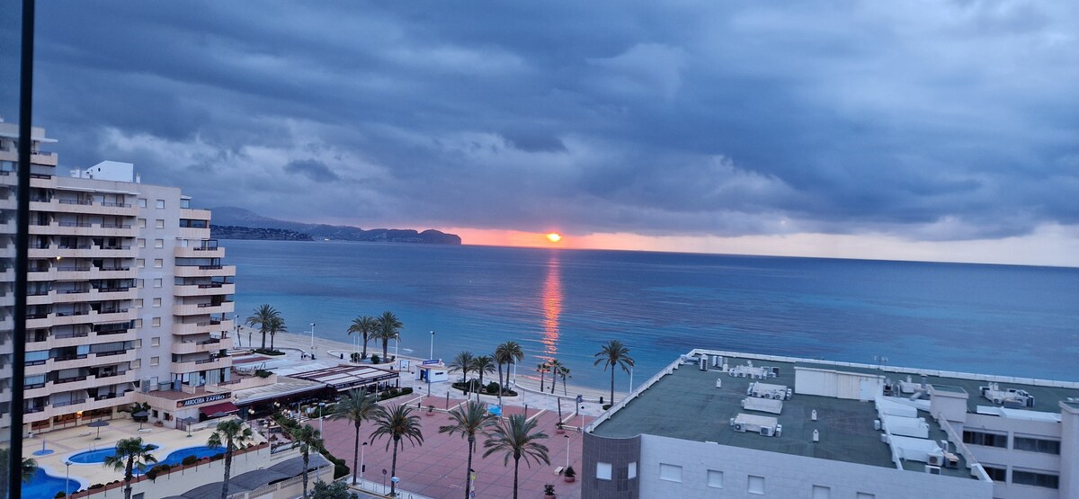 Holidays by the sea in Calpe! Newly refurbished one-bedroom apartment with stunning views of the Mediterranean Sea located in the immediate vicinity of the Peñon de Ifach Natural Park. Enjoy incredible sunrises from its large glazed terrace. The apartment has one bedroom, a bright living room with sofa bed, fully equipped kitchen, internet connection and access to all the amenities of the building, including swimming pool and garage.
