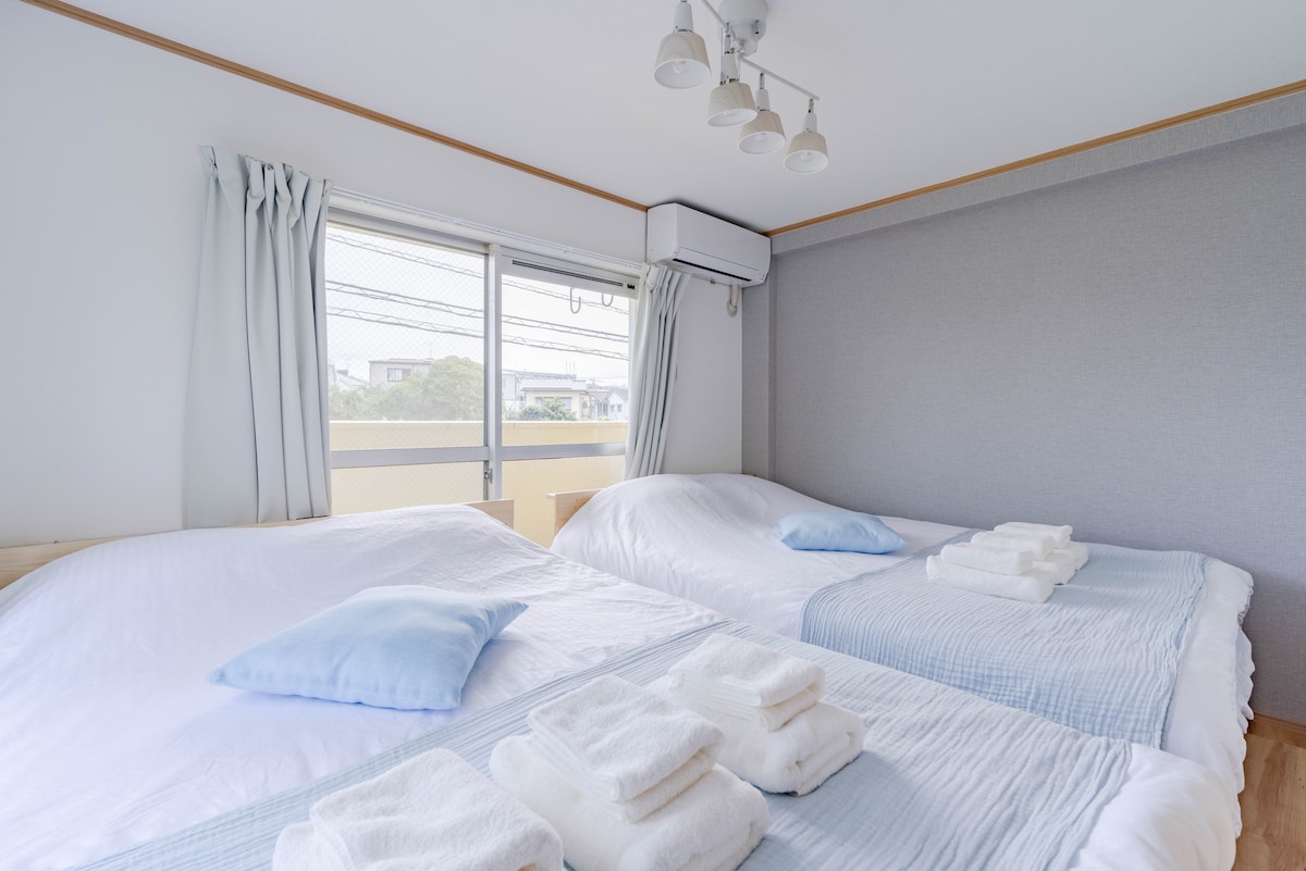 おかげさまで現在予約が大変多い状況です。予期せぬダブルブッキングを避けるため、今すぐ予約確定が出来ないモードで運営中です。申し込みを受け付けた後ホストからの承認で予約確定します。通常1時間程度で返信しています。 人数を正しくご入力いただくと、宿泊料金が自動計算されます。 一軒家を改装して中身は最新の住宅に仕上げました。8人まで泊まることができます。プライバシーを問わないファミリー向け施設です。エアコンは一階2階とも一台ずつです。建物は72m2です。 2階建て、2階に洋室と和室の2部屋あります。2階には6人宿泊準備出来ます。1階には2人です。 配分のリクエストがあればそれに従います。なければ2階和室が優先です。 1階にはキッチンスペースと和室、浴室です。 駐車場1台無料です。狭いので大型車はNG。 無料ポケットWifiがあります。 1階と2階にそれぞれトイレがあります。 通常生活するためのアメニティやタオル、ドライヤーは準備しています。部屋の中を画像やYoutubeで確認してください。 コンビニ、スーパーマーケット共歩いて3-7分程度です。駅からは歩いて12分です。